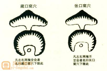 窝穴即开口穴也,也叫窟穴。凡是鸡窝、锅底、掌心、旋螺、金盆、铜锣等形,皆窝穴之别名。乃穴星开口生两掬。